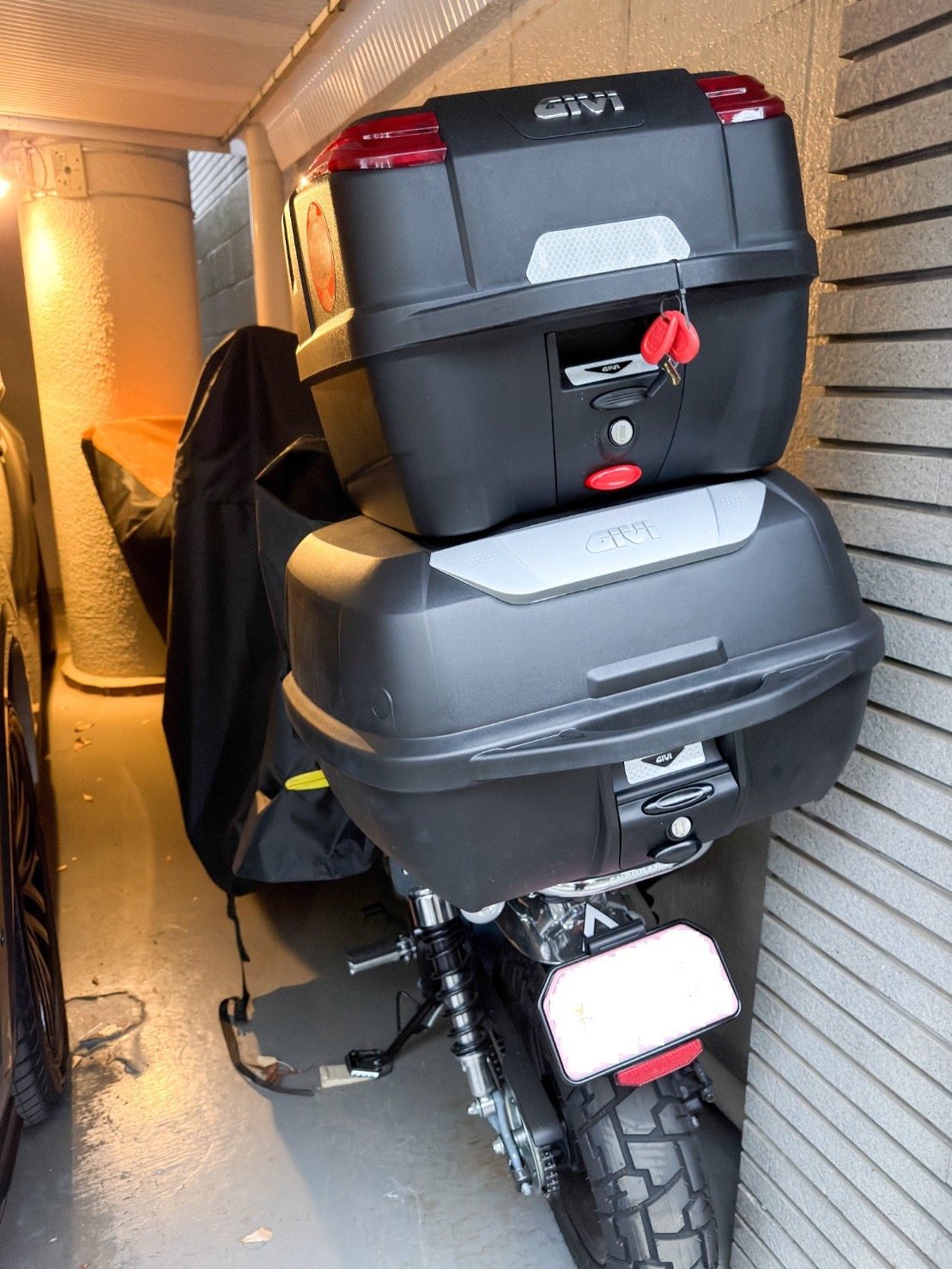 Monkey125の リアボックス 33L (上)が 少し小さくヘルメット収納に手古摺るので 43L (下)を買い直した・・