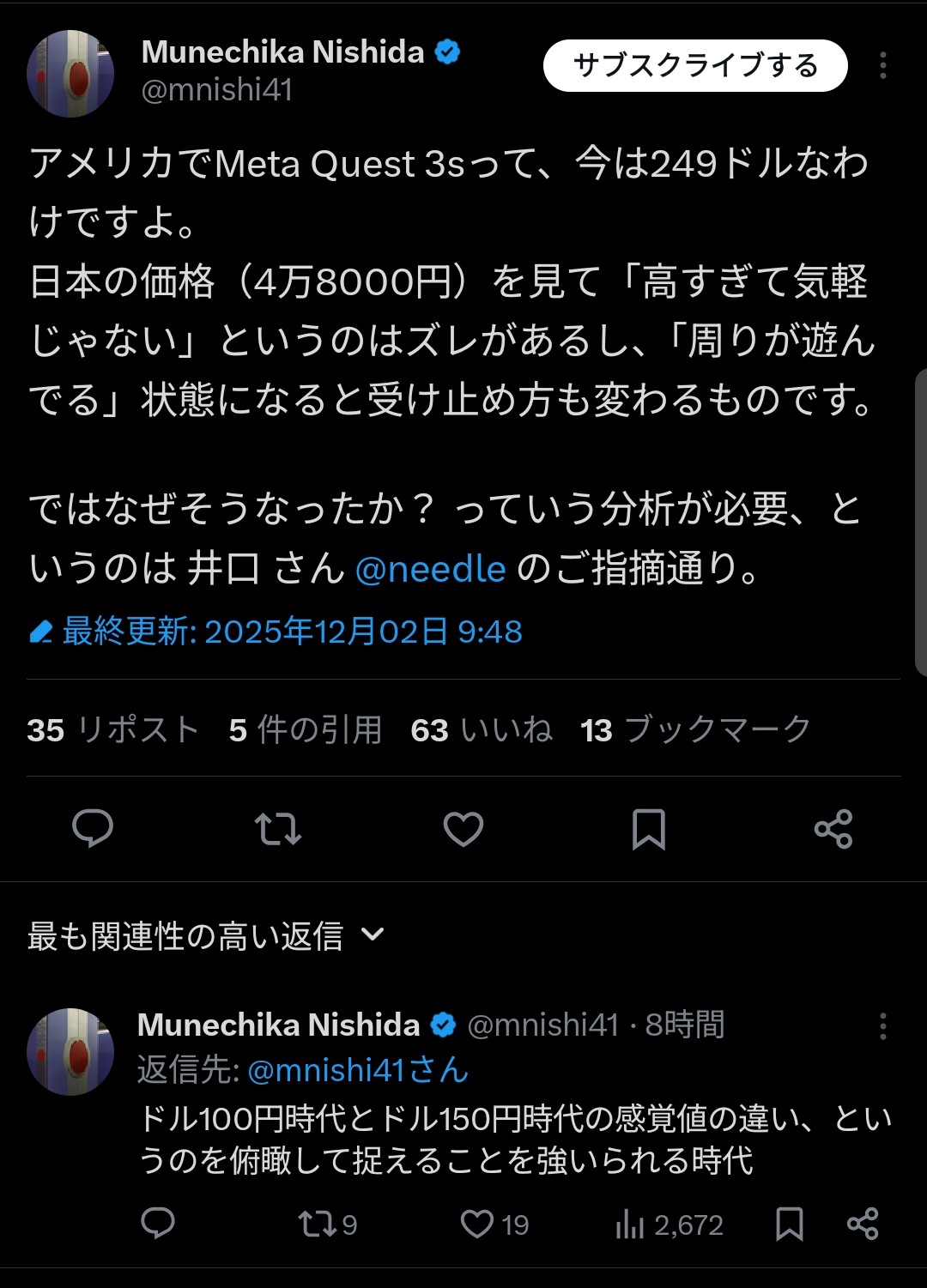 今米国でSwitch Liteが229ドルらしい、Quest3sはそれよりちょっと高いくらい。日本だとそれぞれ約22000円と48000円で倍以上違う…そりゃ市場の動向変わるよなと。レート考えるとそれぞれが地元では安く売ってるって感じだけど