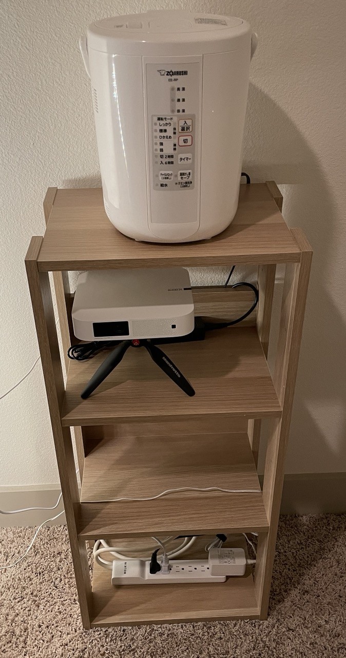 小一時間かけて寝室のプロジェクターと加湿器用の棚設置。見た目より重いけど毛の長めの絨毯の上だとなんか不安定かも…合板の安っぽいやつなのにネジ30個もあった。中指の皮剥けた。