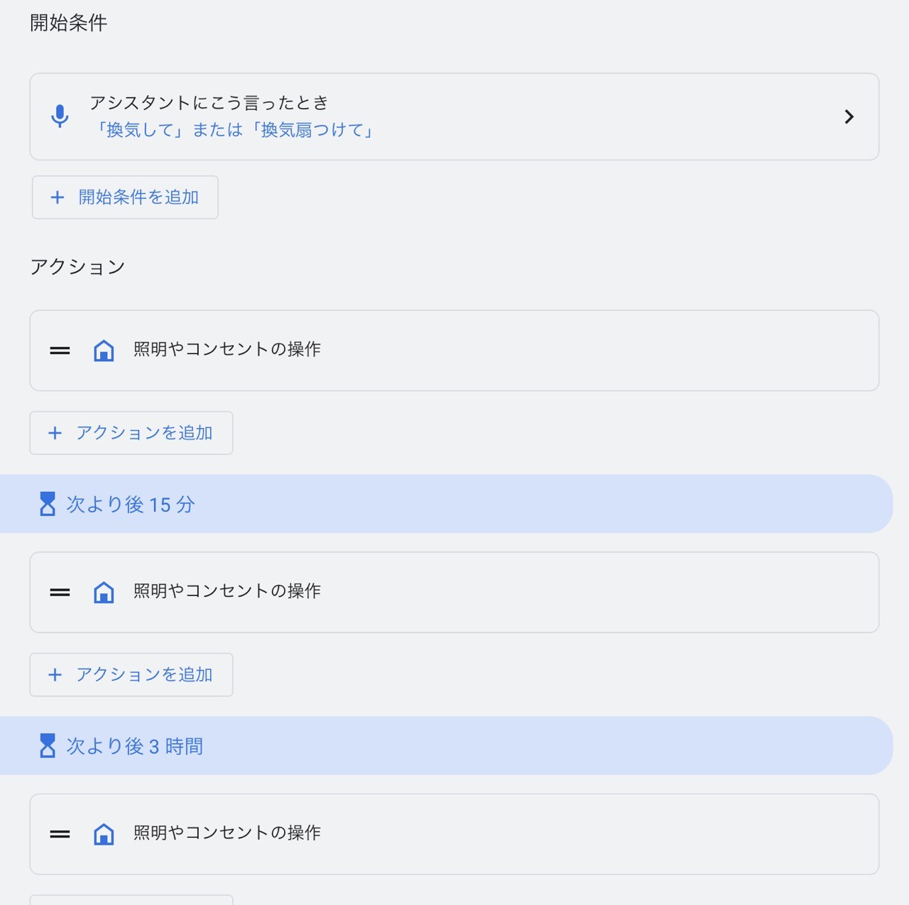 Google Homeで指定時間後にスイッチを切るルーティンを作るのが簡単になってた。同じことをHomeKitでやろうとするとすごい面倒くさい命令になる(たぶん)。ただし実行中にもう一度同じルーティンを実行しようとすると怒られる。一度終了しないといけない。上書きでルーティン実行してくれたら良いのに。