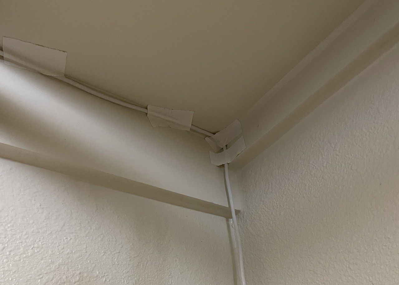 結局フラットでもない細目のcat6ケーブルをダクトテープで止めるという力技になった。クローゼットのハンガーかけの後ろだからまあ目にはつかないので(=^ェ^)σヨシ!