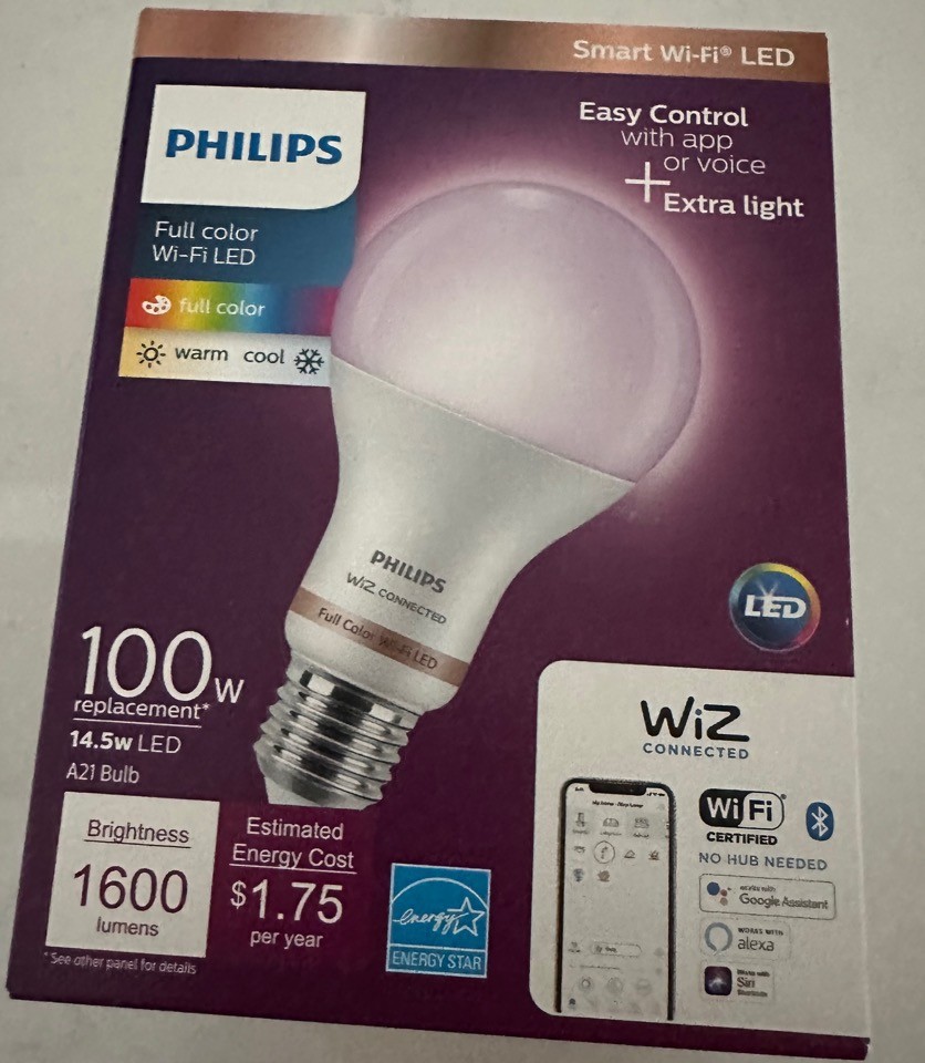 Philips Hueの電球White & color ambience(1600ルーメン)が欲しかったんだけど、電球に$65がどうしても出す気にならなくてPhilips Wizの同じスペックの電球を買ってみた。お値段$17…。