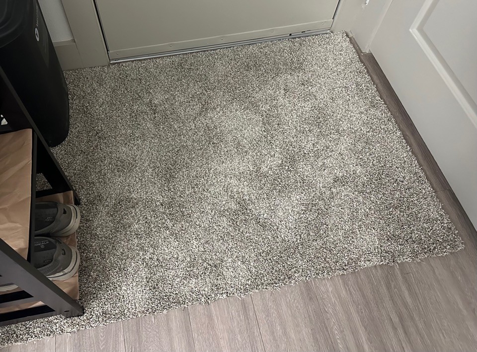 このクソダサ玄関をなんとかしたい週末…引っ越し後に適当に配置したタイルカーペット…ちょっと色違いでアクセント付けようとしたのが😇 ほどダサい…