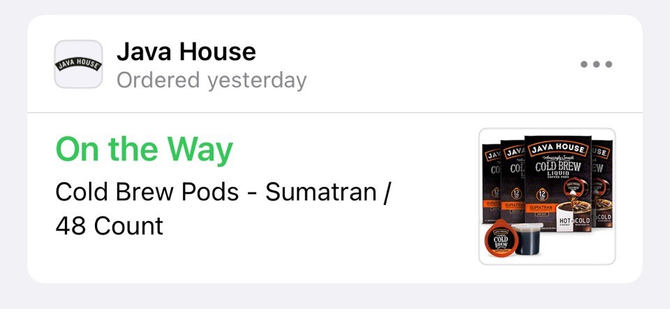 Apple Pay使って買ったやつはWalletからtrackingできるようになってた。いつも買ってるコーヒーポッド、メーカーサイトから定期購入した方が安いことに気がついた。