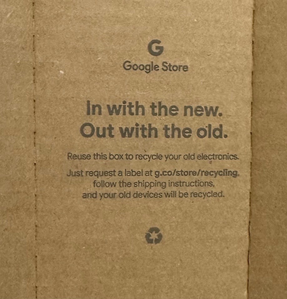 Pixel 7の入ってた箱のフタの裏側。この箱をそのまま使って古い電子機器をGoogleに送ってリサイクルできるみたい。なかなか賢い。後で詳細を見てみよう。
