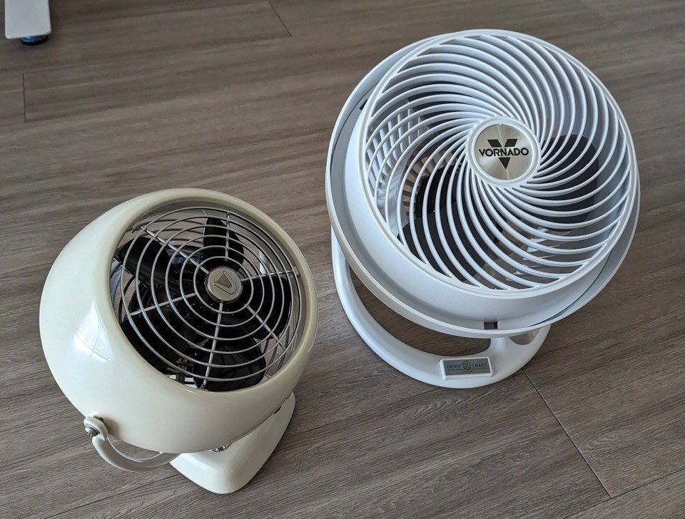 みんな大好きVornado。右が新人。Mサイズのやつで軽いけど思ったより大きかった。でもだいぶ風量強くなっていい感じ。