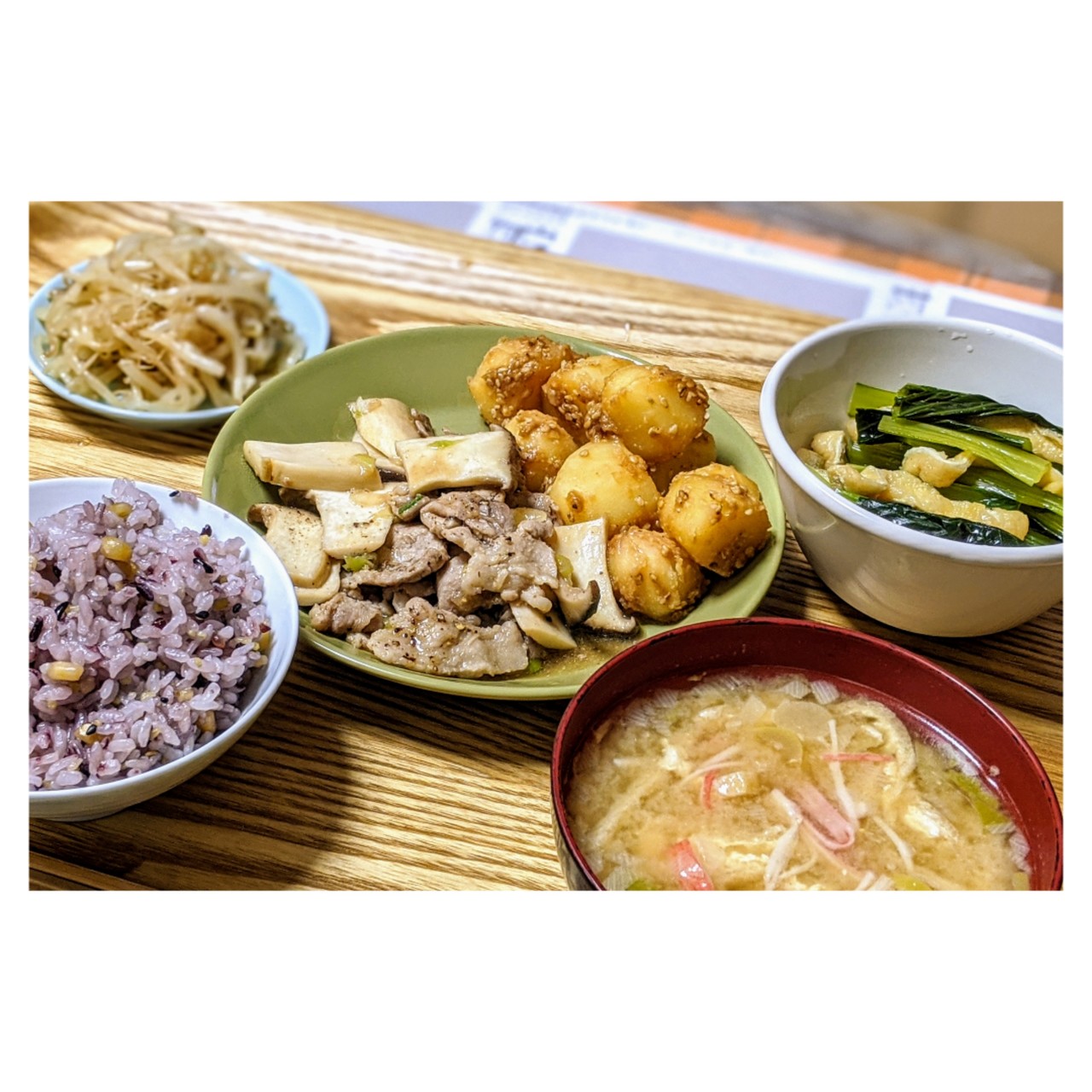 豚エリンギ炒め、じゃが味噌和え、カニカマの味噌汁、小松菜のお浸し、もやしナムル… https://mstdn.guru/media/eCMUucQgIsjbCW8XoXo