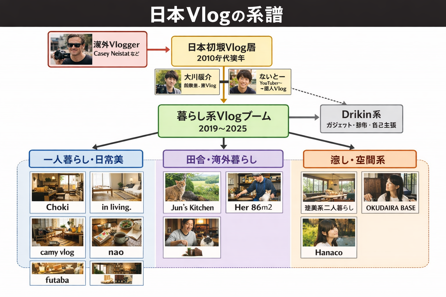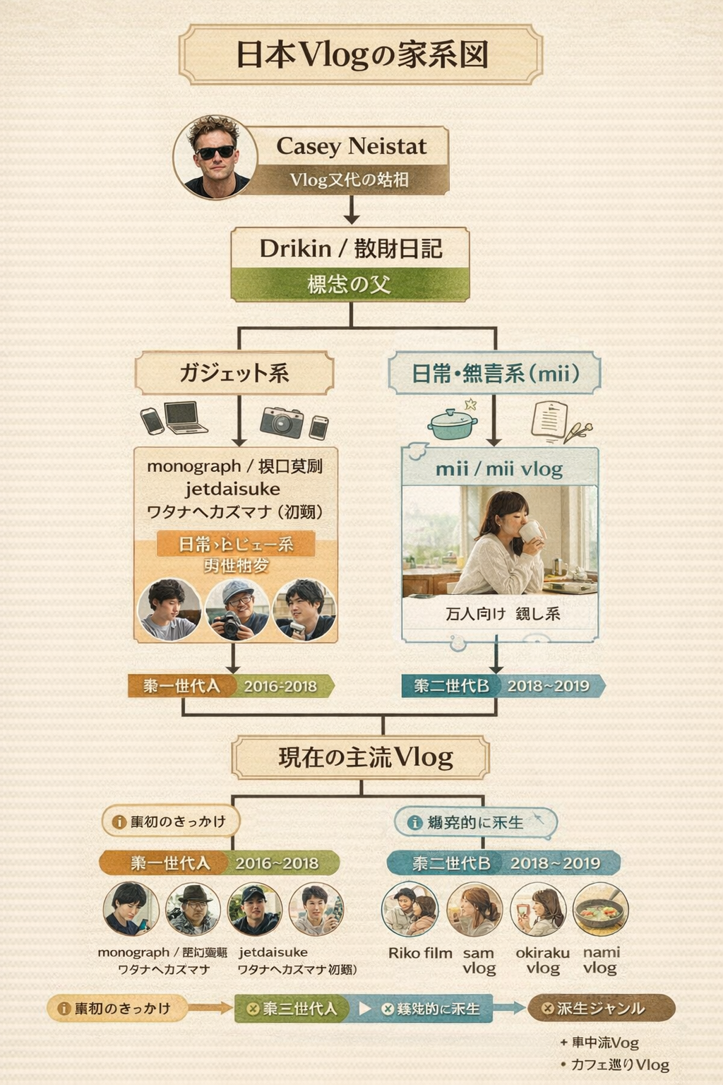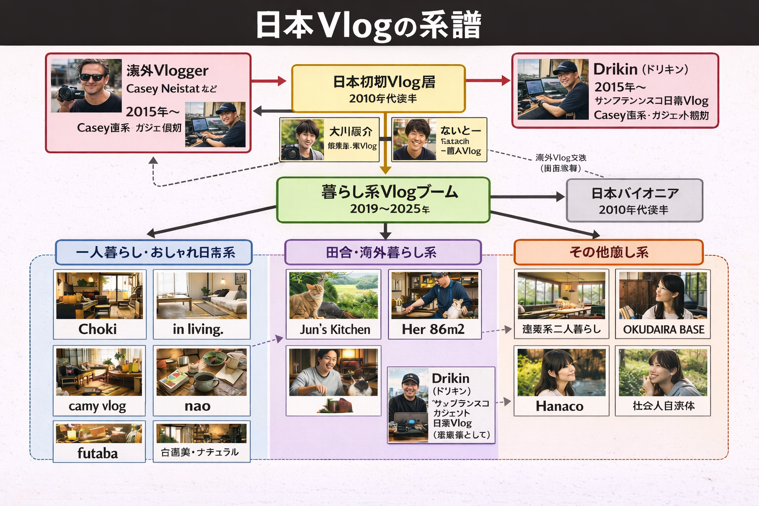 Casey NeistatのVlogに強く影響を受け、2010年代中盤頃から本格的にスタート。当時、日本では「おっさんがYouTubeに出るのは恥ずかしい」みたいな空気があった中、海外スタイルの日常Vlogを導入したパイオニアとして知られています。