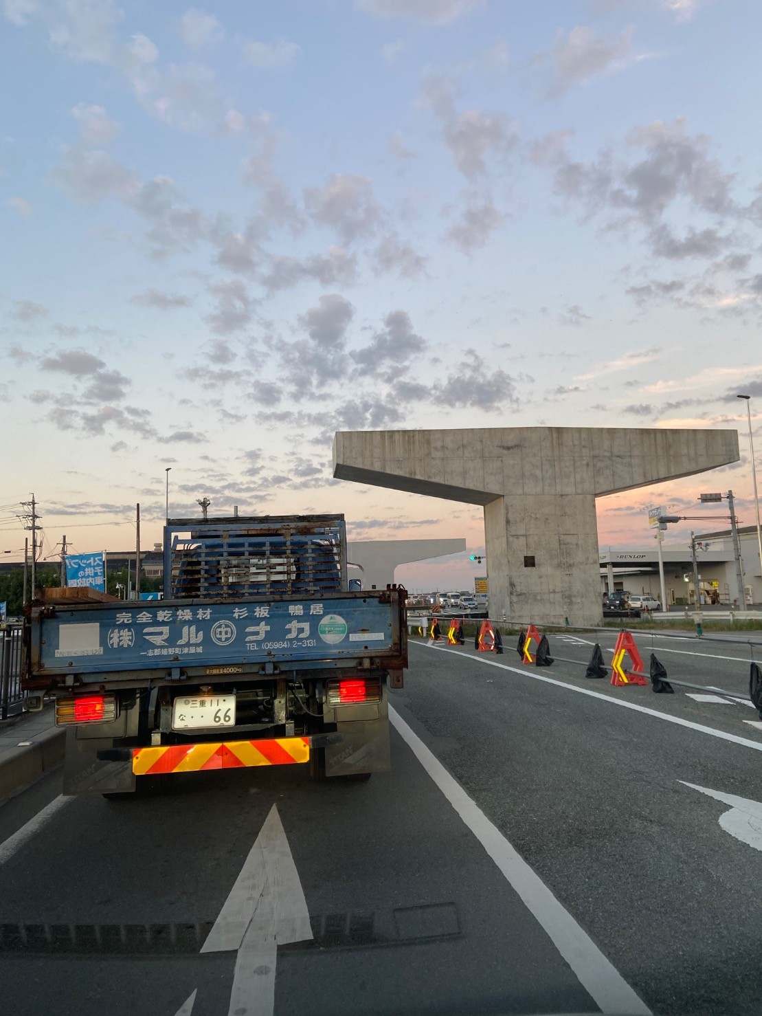 写真はひろし社長の運転するタイタンに同行中の松阪市内の夕景。