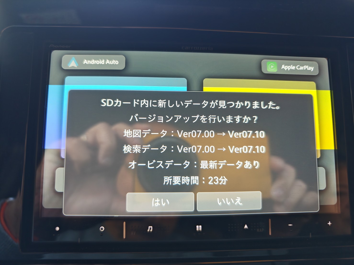 ウチの車(カミさんのだけど)も今朝アップデートをかけました。5分かかったか かかんなかった位だったかなあ。再起動したら画面の上方にCarPlay と Android Autoの表示が出てましたよ。