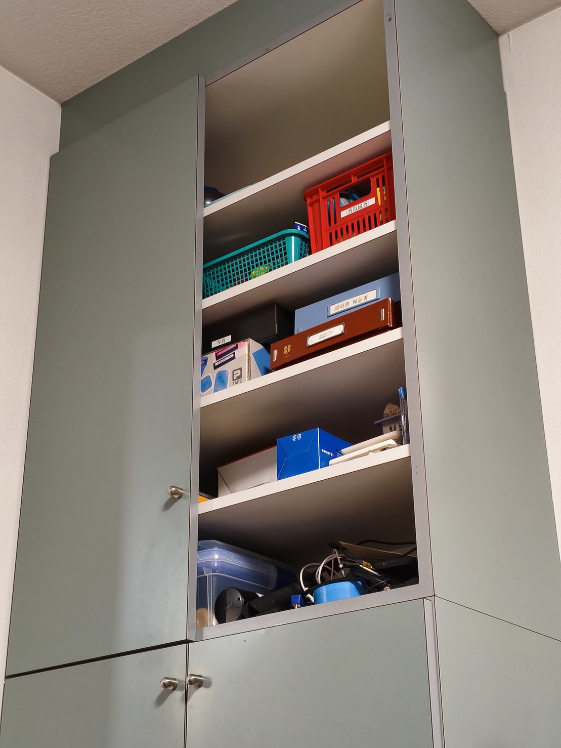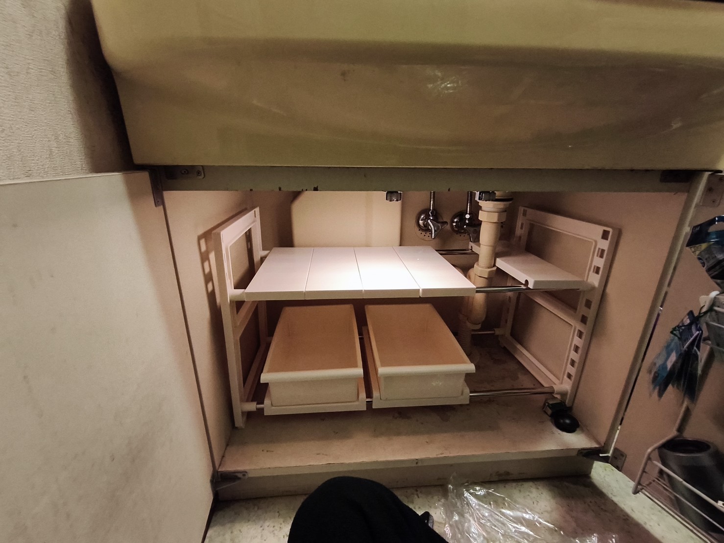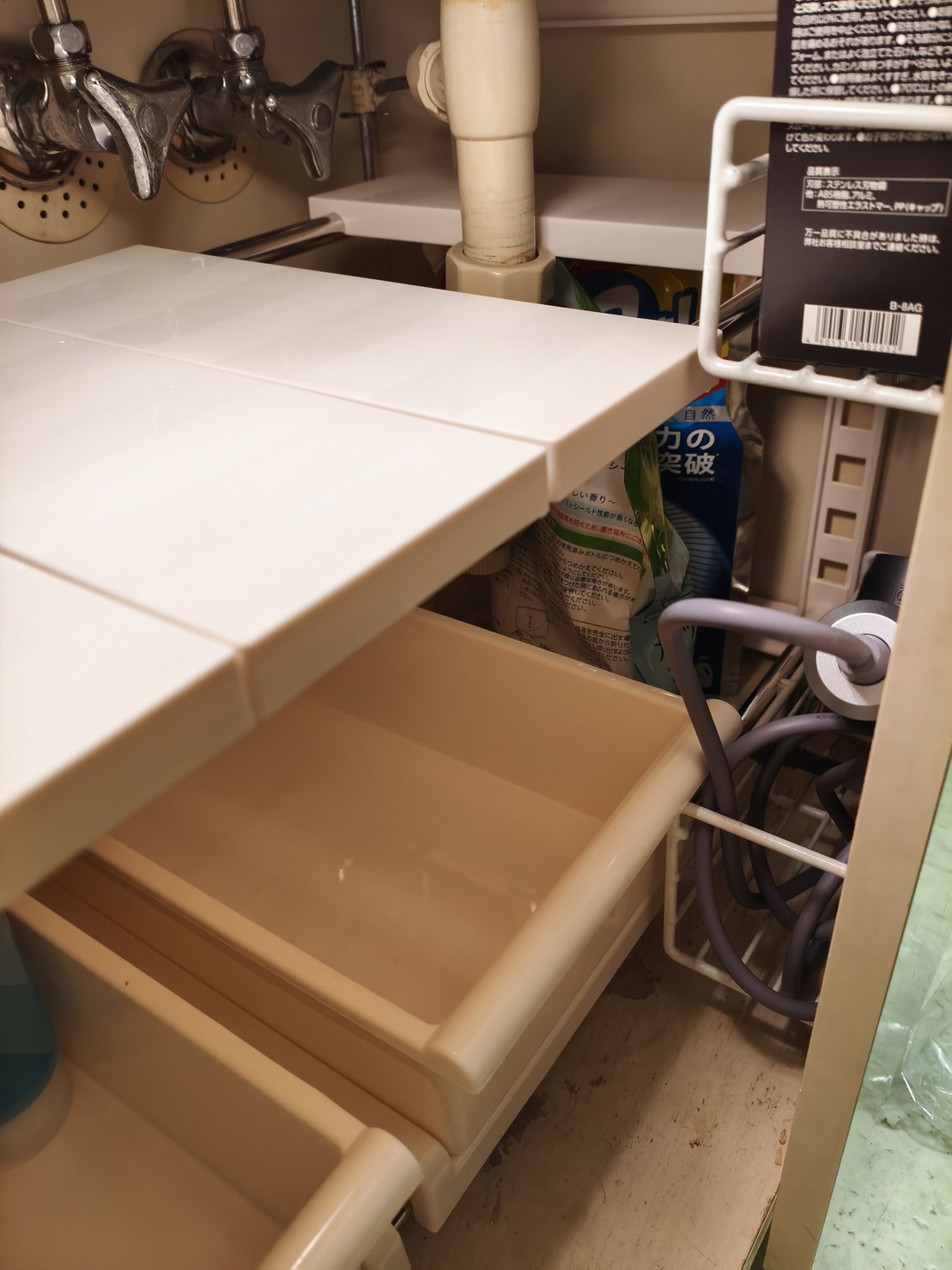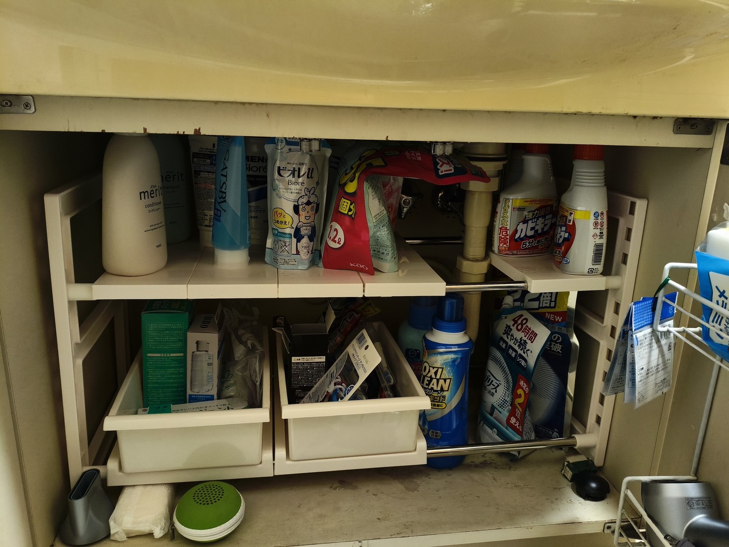 洗面台下の修理してたついでに中の整理しようと調整できる棚導入。