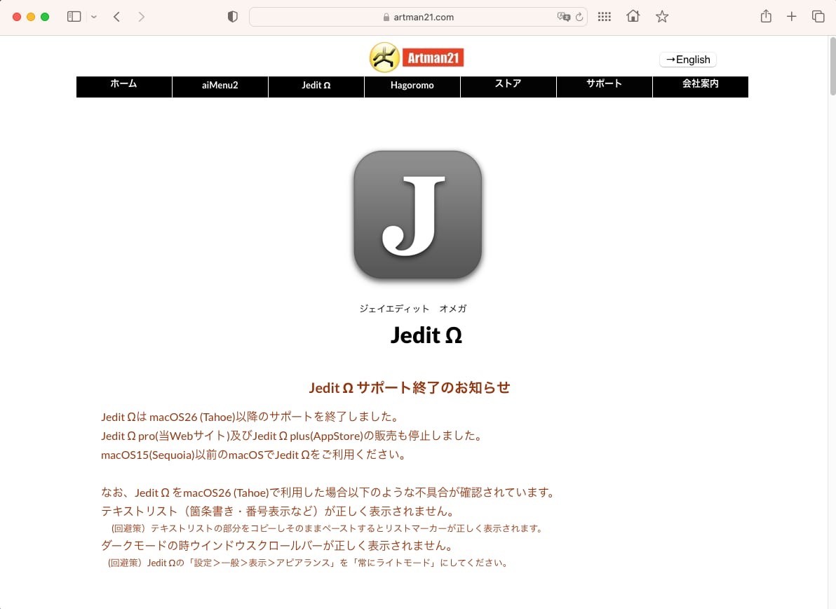 “Macの老舗テキストエディタ「Jedit Ω」がサポート終了 95年の初代登場から30年の“定番”” https://www.itmedia.co.jp/news/articles/2511/27/news137.html