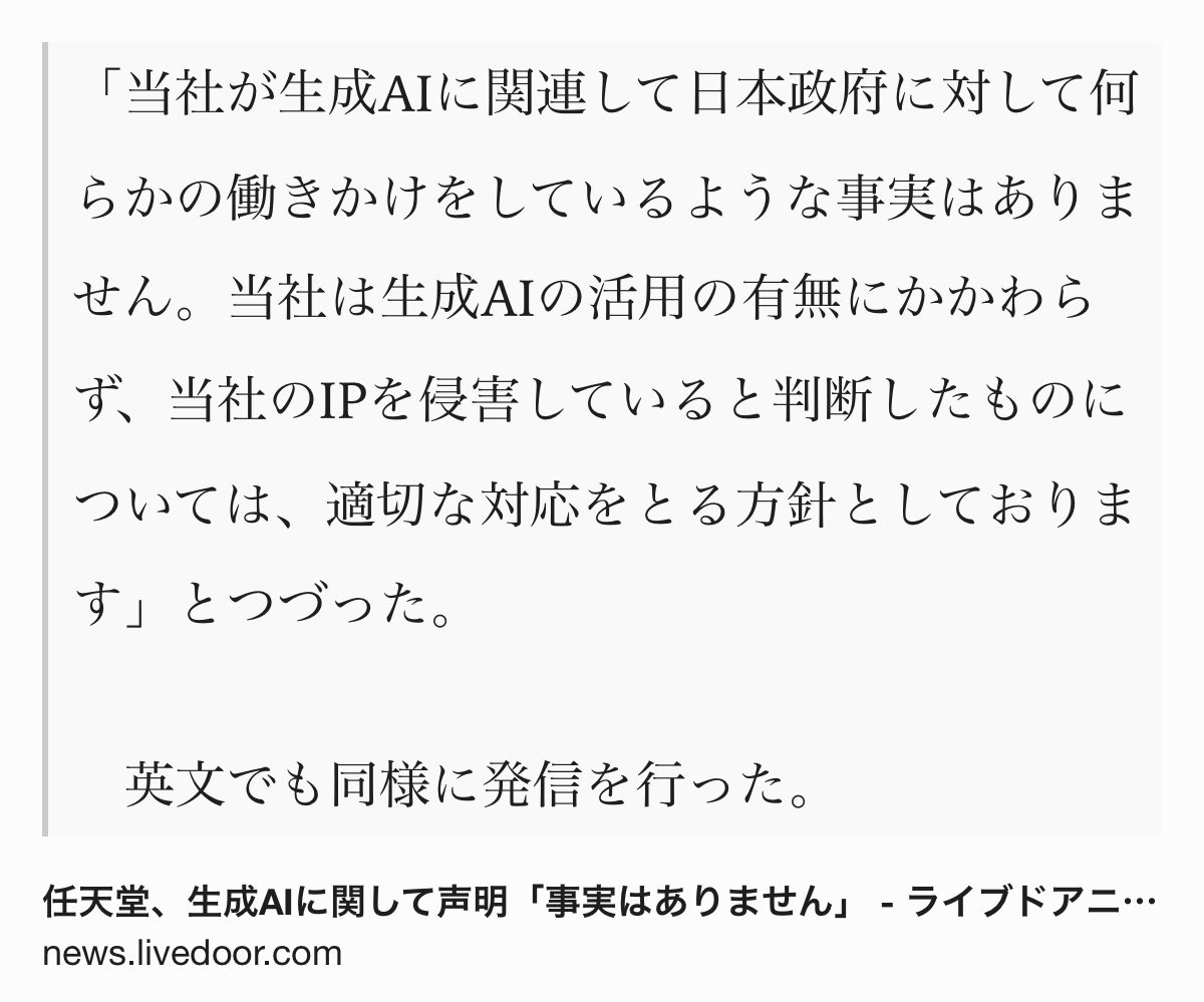 “任天堂、生成AIに関して声明「事実はありません」 - ライブドアニュース” https://news.livedoor.com/article/detail/29715369/
