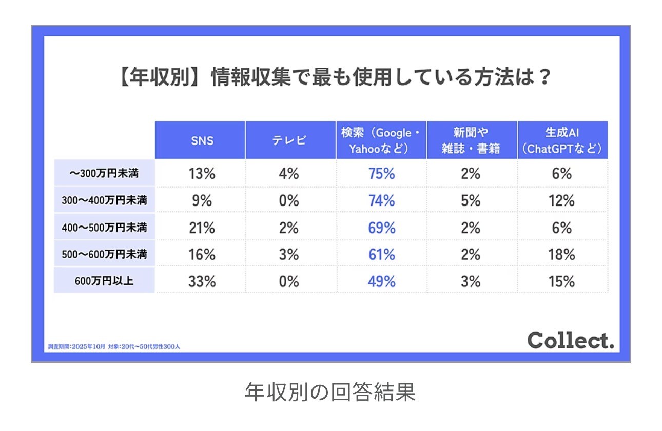 情報収集スタイルは年収で変化? 年収600万円超でSNS・生成AIの活用が目立つ【Collect.調べ】 webtan.impress.co.jp/n/2025/12