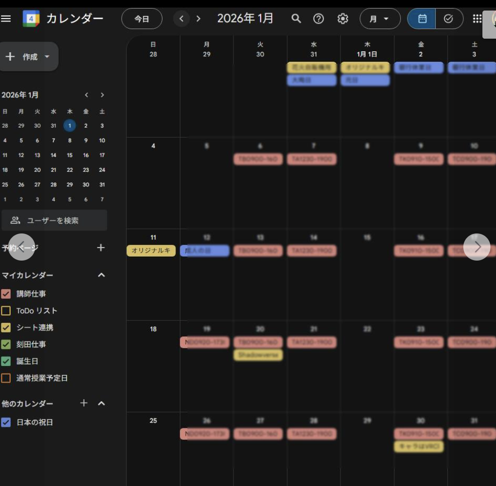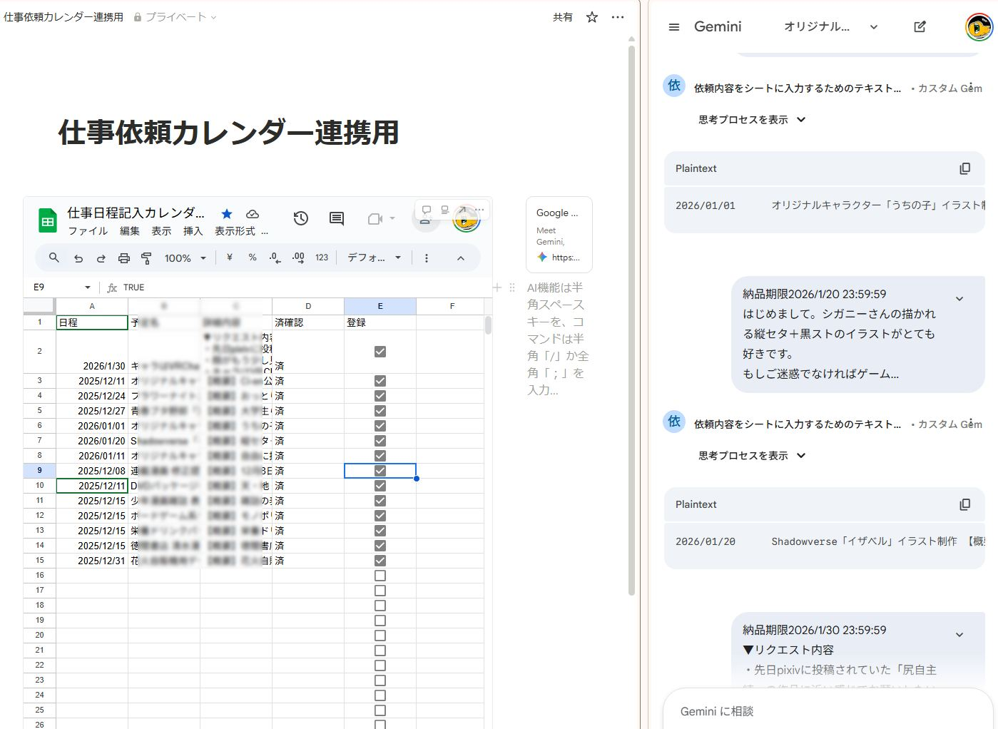 現状は依頼内容をGemに入れて日付、要約(カレンダー用のタイトル)、内容(メモに入れる)を自動で作成して、それを専用のスプレッドシートに入れると、GASで自動的にカレンダーに同期できる(黄色のスケジュール)という仕組みができました。