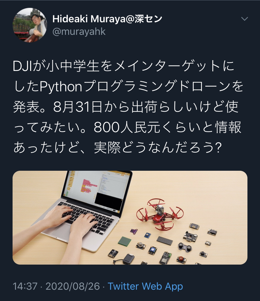 >> DJIが小中学生をメインターゲットにしたPythonプログラミングドローンを発表。8月31日から出荷らしいけど使ってみたい。800人民元くらいと情報あったけど、実際どうなんだろう?