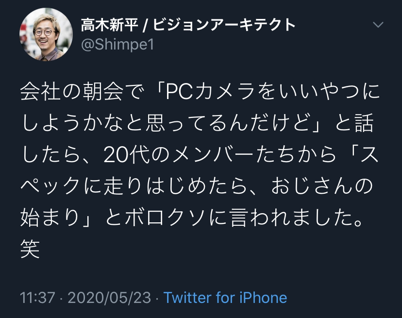 >> 会社の朝会で「PCカメラをいいやつにしようかなと思ってるんだけど」と話したら、20代のメンバーたちから「スペックに走りはじめたら、おじさんの始まり」とボロクソに言われました。笑