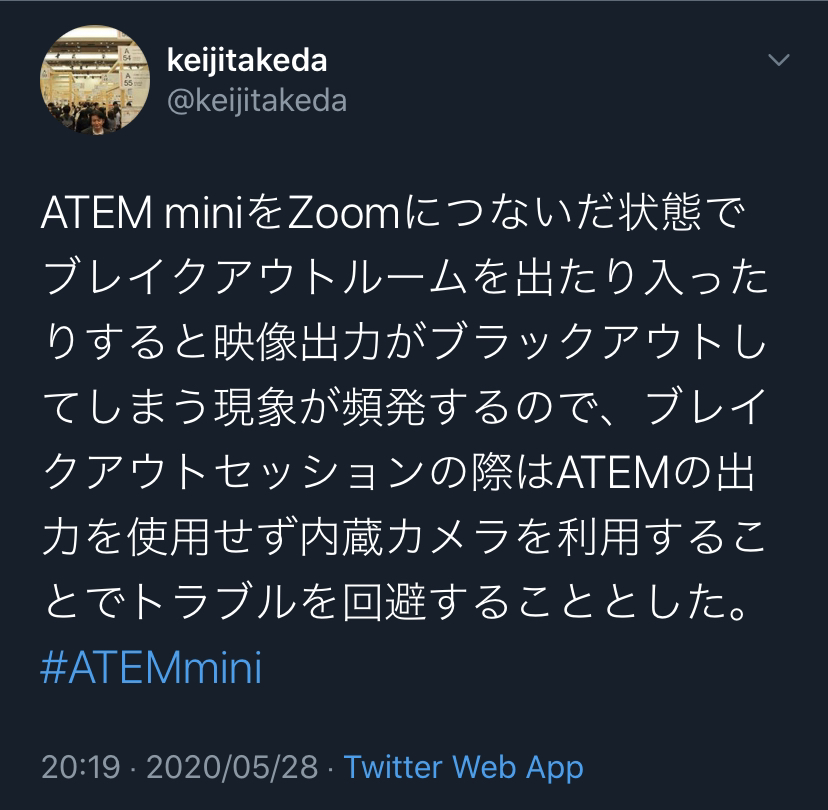 >> ATEM miniをZoomにつないだ状態でブレイクアウトルームを出たり入ったりすると映像出力がブラックアウトしてしまう現象が頻発するので、ブレイクアウトセッションの際はATEMの出力を使用せず内蔵カメラを利用することでトラブルを回避することとした。
