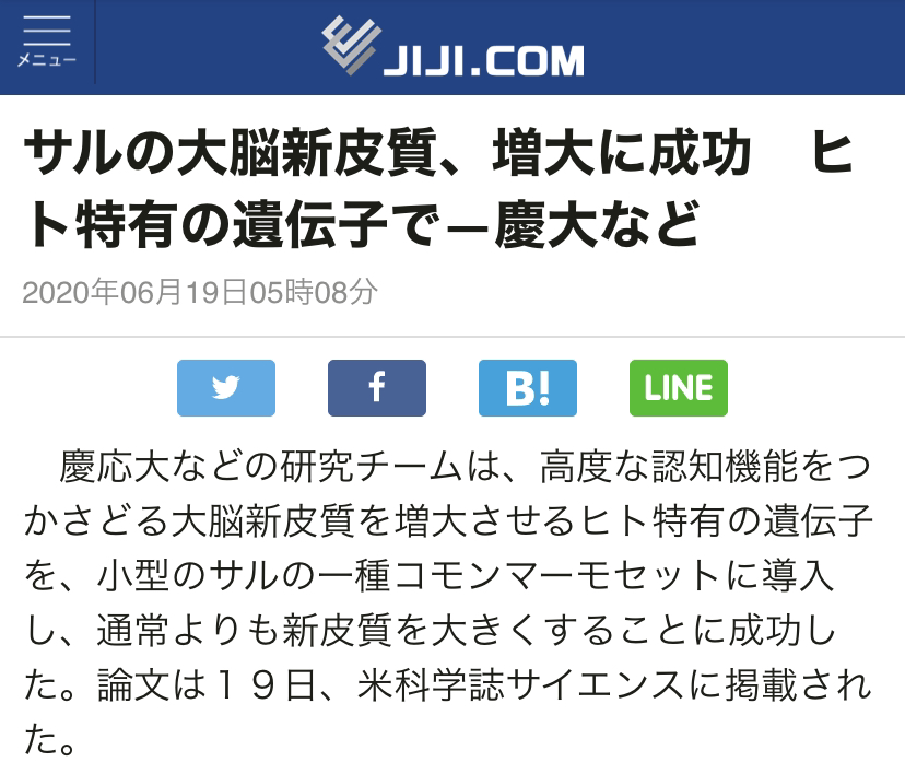 サルの大脳新皮質、増大に成功 ヒト特有の遺伝子で―慶大など:時事ドットコム