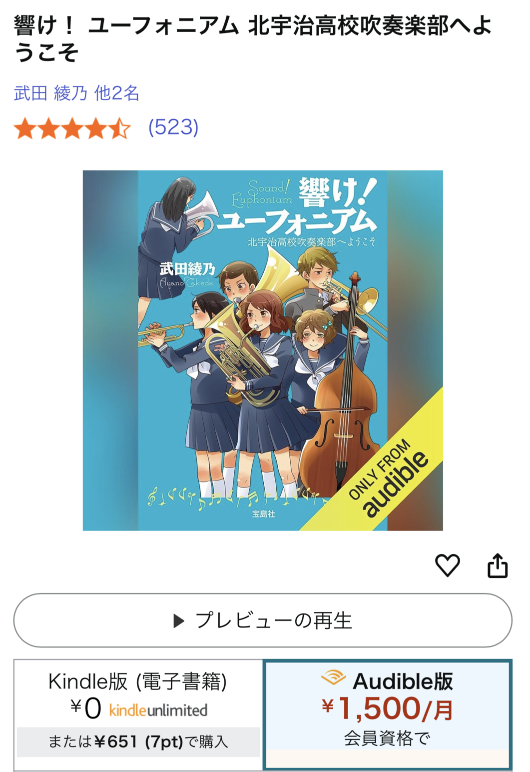 響けユーフォニアムのAudibleがリリースされてる。プレビューを聴いてみたけど、アニメに慣れている自分には関西弁が違和感があり、1分で止めてしまった
