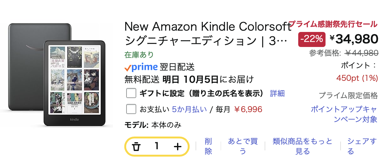 安いですが、7月にPaperwhiteシグニチャーエディション 第12世代を購入したばかりなので迷いどころ。文字が滲むというレビューもあり、白黒がメインの自分には微妙なところ。しかし、サムネや挿絵がカラーになるのが魅力的