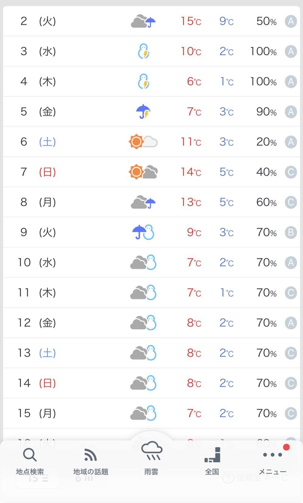 やけにタイヤ交換をしている人が多いと思ったら、天気予報に雪マークが多い。気温が高いから油断してた
