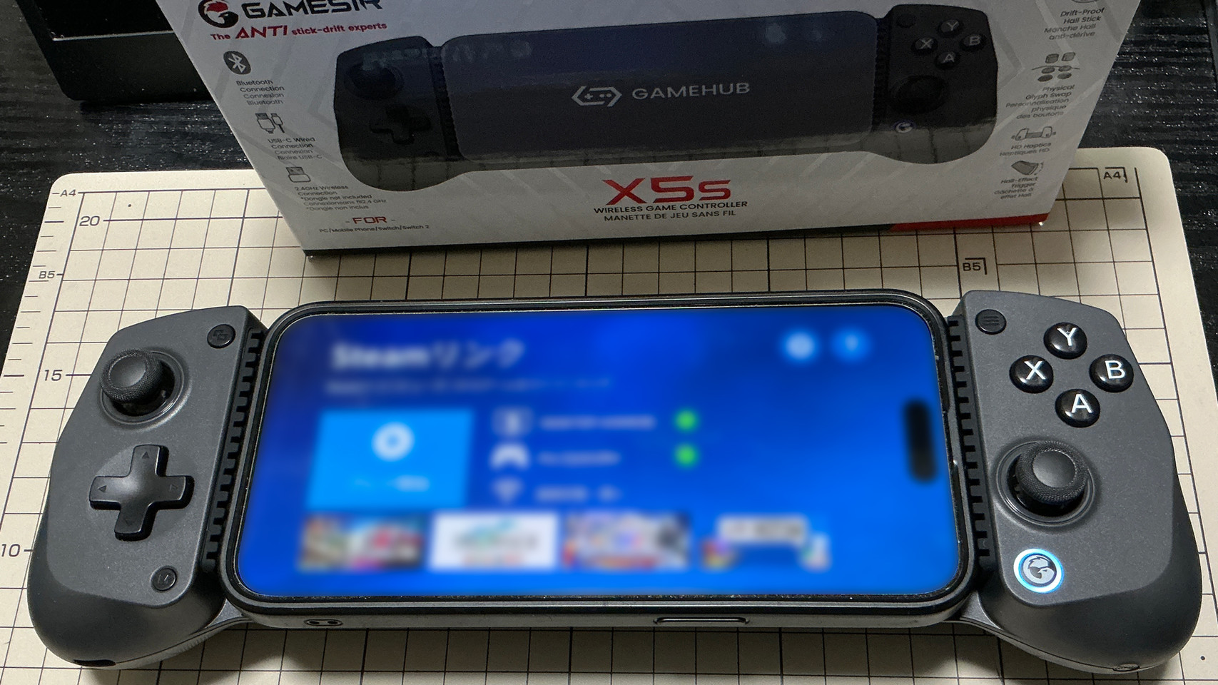 PCとiPhoneでSteamLinkやろうと思ってGameSir X5s購入して試してみてた。構造上Type-Cが埋まるので音声はPCから出力。接続はBluetooth。軽く触ってみた感じ、遅延はそれほど感じない。画面が小さいのはしょうがない。作りはしっかりしてるけど、正確な操作は慣れが必要そう。