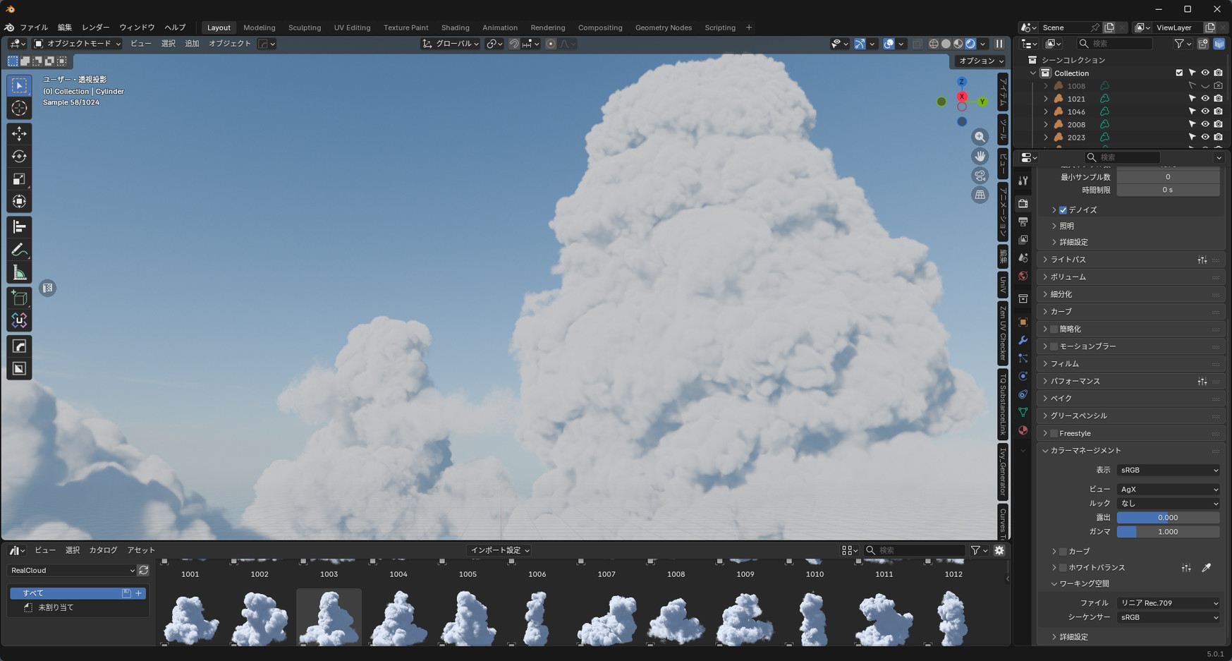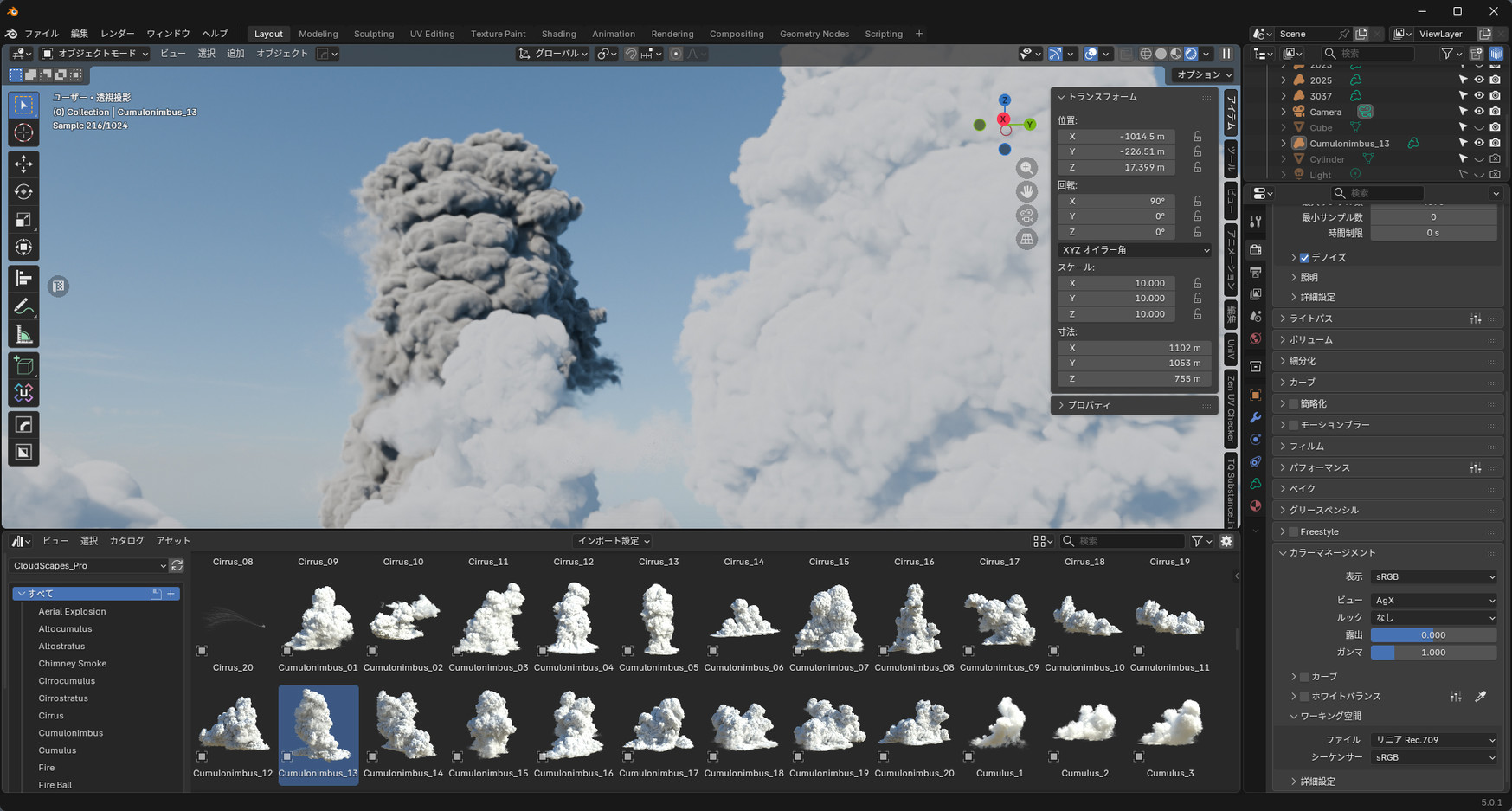積乱雲の空の表現をBlenderで作れないかと思って、RealCloudやCloudScapes Proの雲アセット配置して色々調べてみてる。普通に置くと大分グレー・黒寄りになるので、色々意図的に細かく調整する必要がありそう。