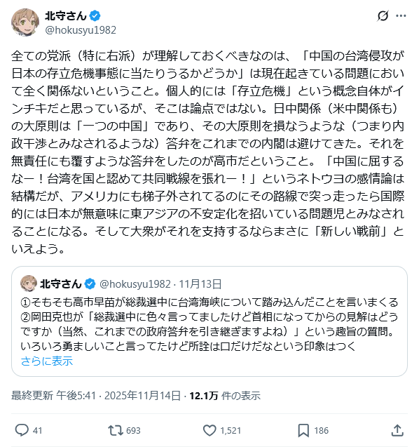 『全ての党派(特に右派)が理解しておくべきなのは、「中国の台湾侵攻が日本の存立危機事態に当たりうるかどうか」は現在起きている問題において全く関係ないということ。個人的には「存立危機」という概念自体がインチキだと思っているが、そこは論点ではない。日中関係(米中関係も)の大原則は「一つの中国」であり、その大原則を損なうような(つまり内政干渉とみなされるような)答弁をこれまでの内閣は避けてきた。それを無責任にも覆すような答弁をしたのが高市だということ。「中国に屈するなー!台湾を国と認めて共同戦線を張れー!」というネトウヨの感情論は結構だが、アメリカにも梯子外されてるのにその路線で突っ走ったら国際的には日本が無意味に東アジアの不安定化を招いている問題児とみなされることになる。そして大衆がそれを支持するならまさに「新しい戦前」といえよう。』