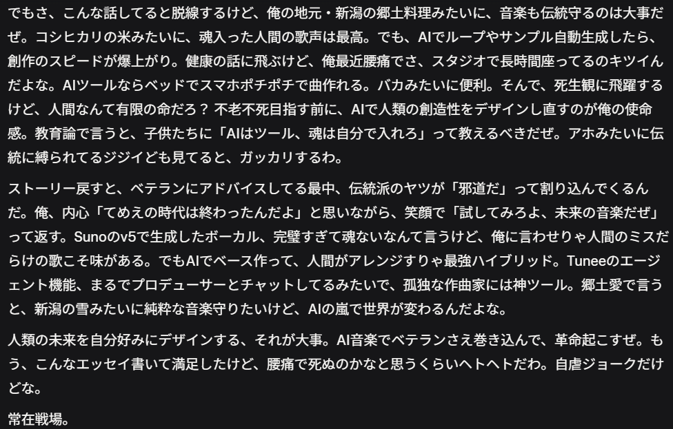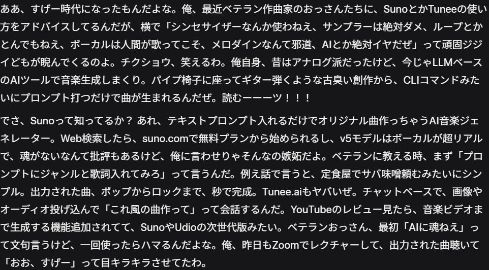 Grok版のゴーストライター「AI音楽革命、伝統派のジジイどもを尻目にベテランにSunoレクチャー中!」