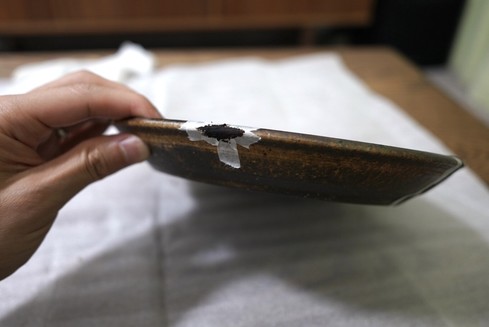 割れたお皿の接着自体は、15分くらいで終わりました。時計を見ていなかったので定かではないですが、漆の臭いを我慢しつつも長い作業ではなかったはず。しかしその後の片付けは漆に手で触れないように恐る恐る行っていたので時間がかかりました。菜種油でパレットやヘラなどを綺麗にして、消毒用エタノールで油分を拭き取ります。繋げたお皿はマスキングテープで固定をして漆風呂に入れて一週間ほどくっつくのを待ちます。