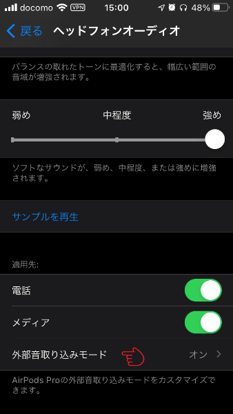 AirPods Proを装着してボリュームコントロールを開き「外部音取り込み」に、設定アプリ→アクセシビリティ→AirPods→オーディオアクセシビリティ設定→ヘッドフォン調整へ進むと画面一番下に「外部音取り込みモード オン/オフ」が現れて(添付画像1枚目)、その中にある外部音取り込みモードのカスタム設定(添付画像2枚目)にある「増幅」を右端にすれば、AirPods Proを簡易の補聴器として使えるのです。(ここ重要)