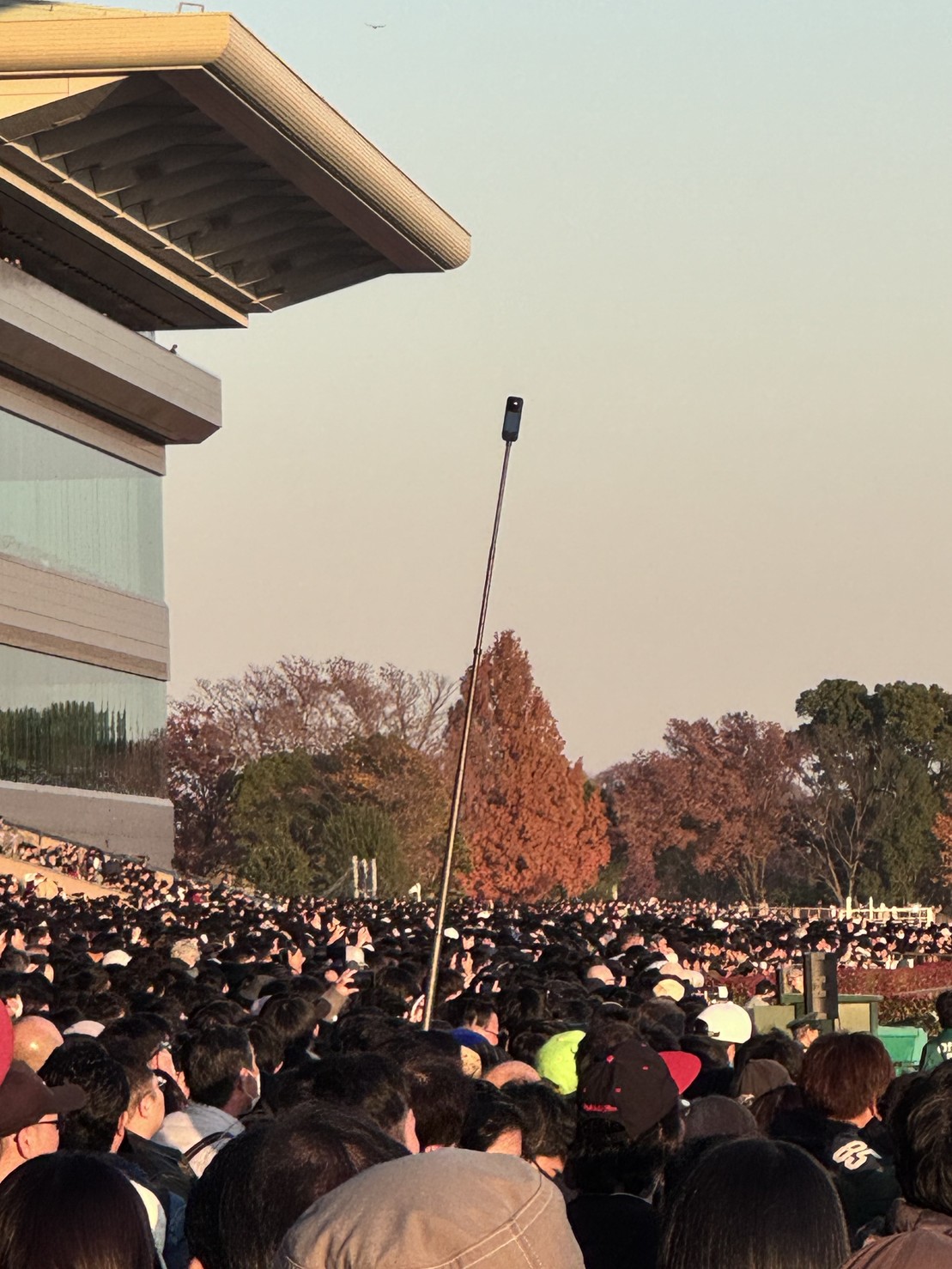 最近の東京競馬場、踏み台や脚立の上に乗ってレースを見たり写真撮ってるやつがいたり無法地帯と化してるけど昨日はこんなのもいた。普通の自撮り棒ですらアウトなのにこれが許されていいわけないだろ❗️