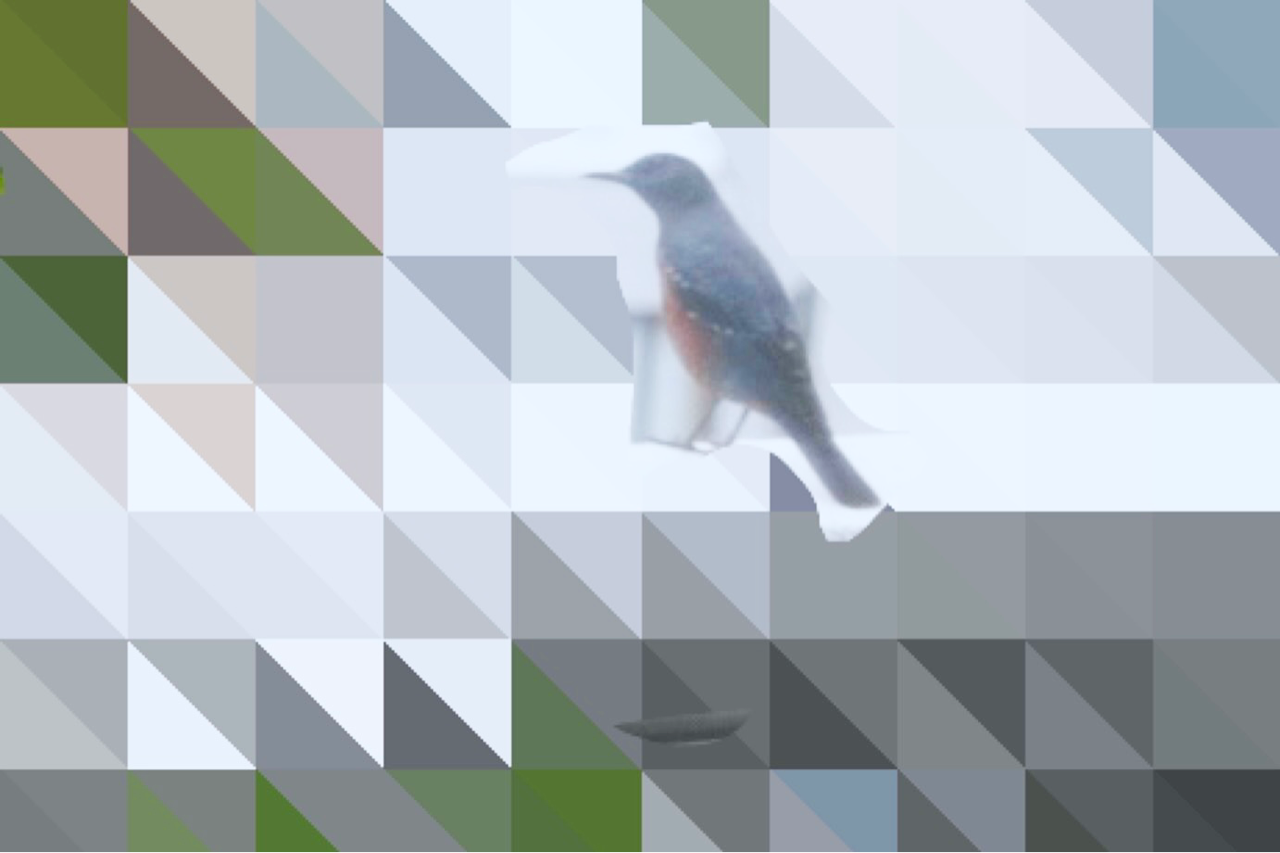 ベランダから突然の鳥の鳴き声。カーテンと網戸越しだったので、白んでいますが、多分イソヒヨドリでしょうか? 綺麗な鳴き声だったので、来年も寄って欲しい。