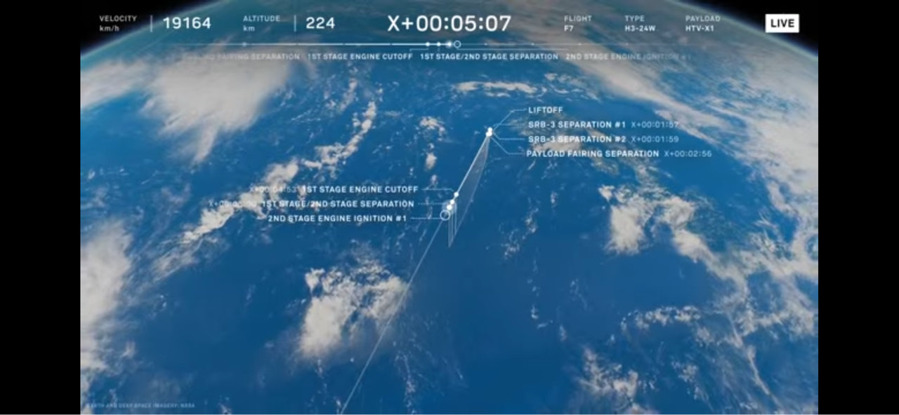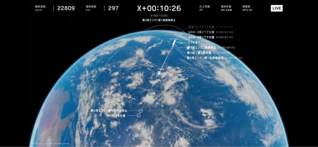 H-3の打ち上げ状況の表示、かっこいい左上の機体速度の数も凄い。