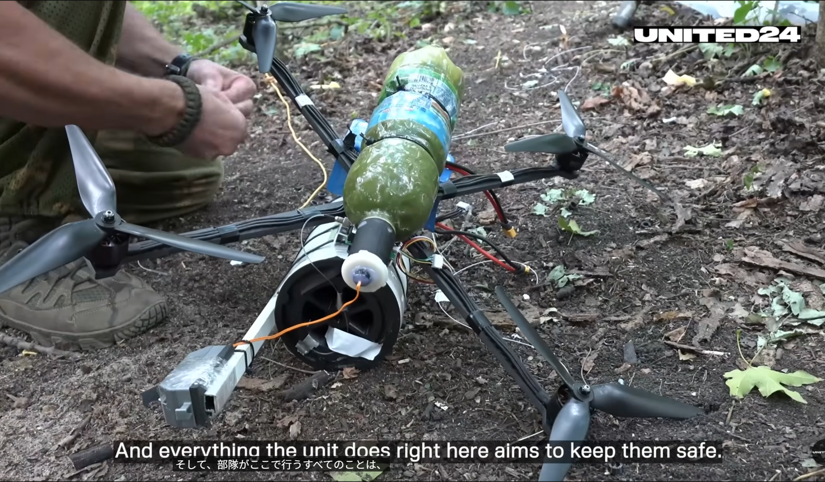 ウクライナ軍の最新光ファイバーFPVドローン。カメラは爆薬の下で見えない?既にRPG7とかの軍事用弾頭では無く、ペットボトル?内に爆薬と榴弾?を入れてるので炸薬以外は全て民生品で製造出来るようになってますね。起爆装置と炸薬さえあれば大量生産可能。戦車や装甲車以外ならこれで十分。